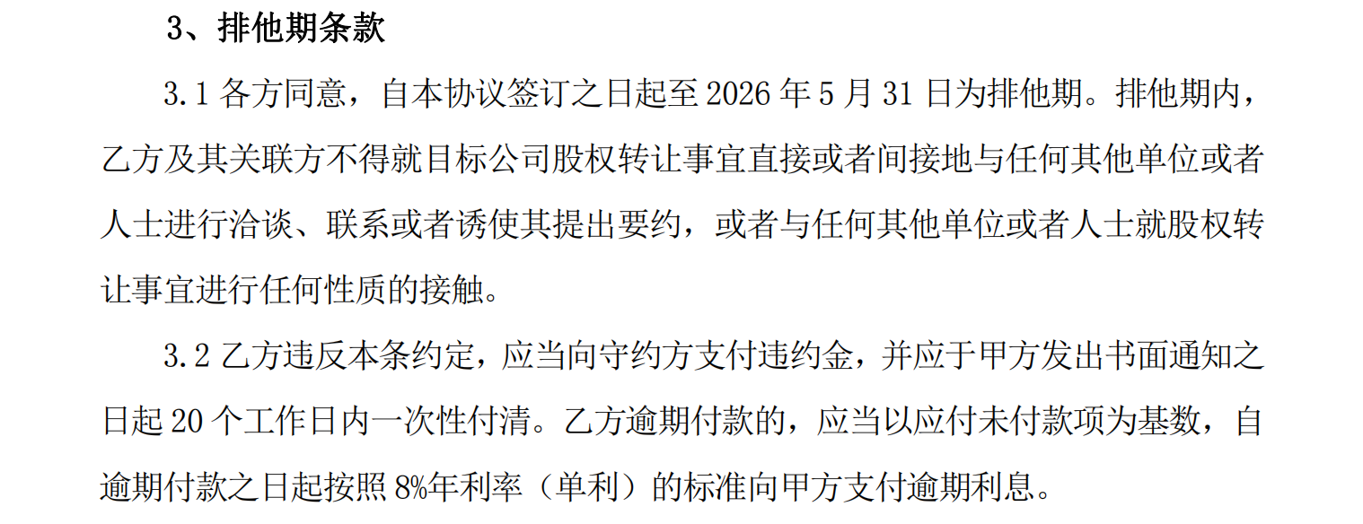 意向条约中竖立了排他期条目:自签署日至2026年5月31日历间,武汉医佳宝鼓励不得与其他方洽谈股权转让事宜,走嘴将承担高额走嘴金及8%年利率的落后利息。